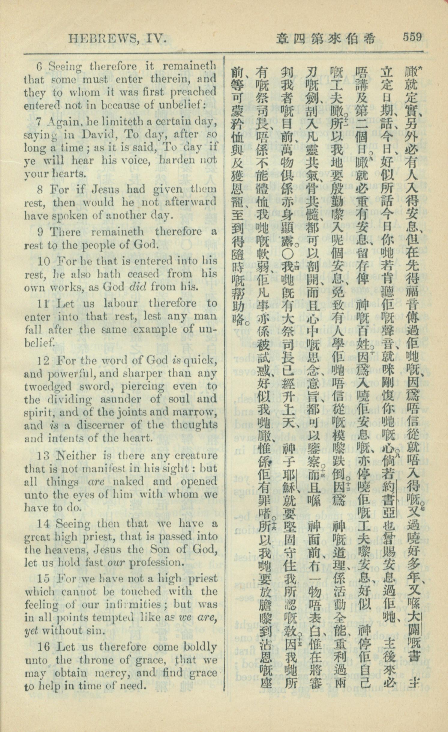 1909年中西字新约全书 希伯来书 4 章 6 节到 4 章 16 节