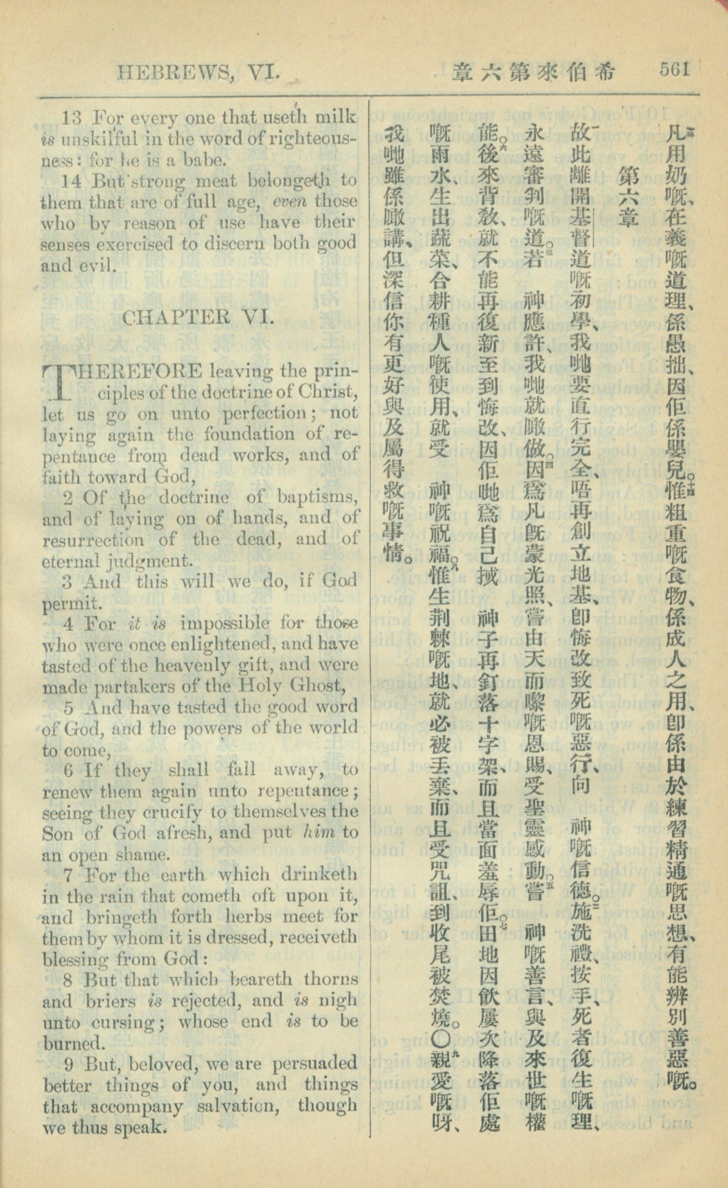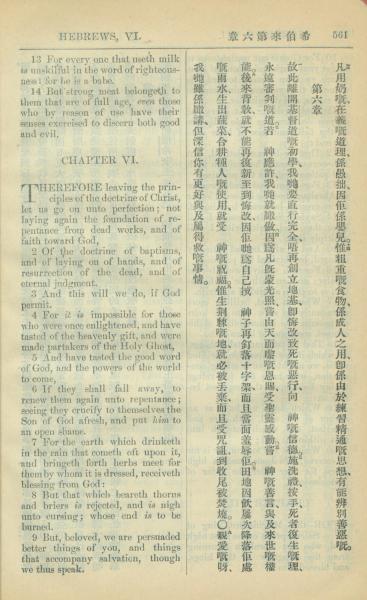 1909年中西字新约全书 希伯来书 5 章 13 节到 6 章 9 节