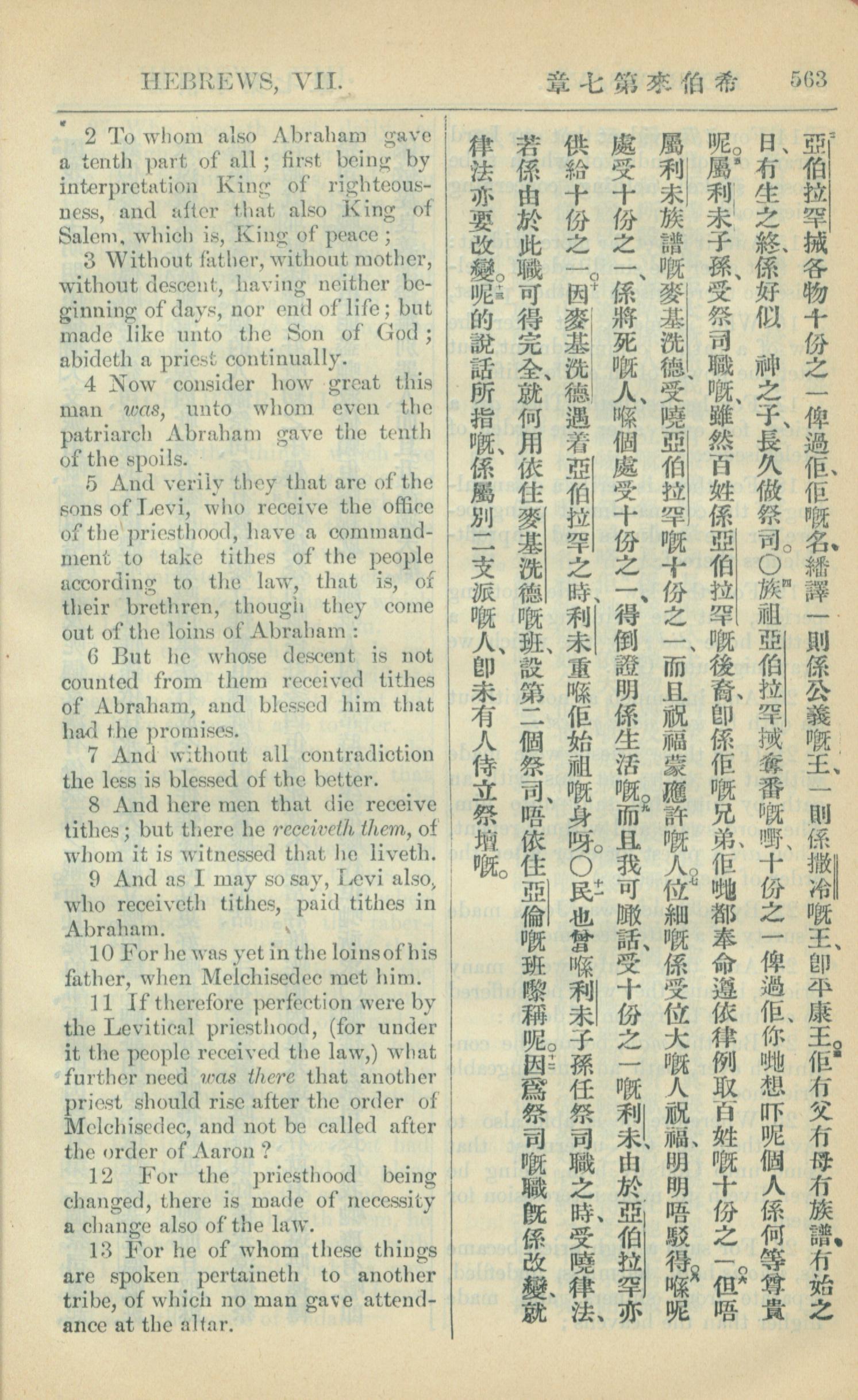 1909年中西字新约全书 希伯来书 7 章 2 节到 7 章 13 节