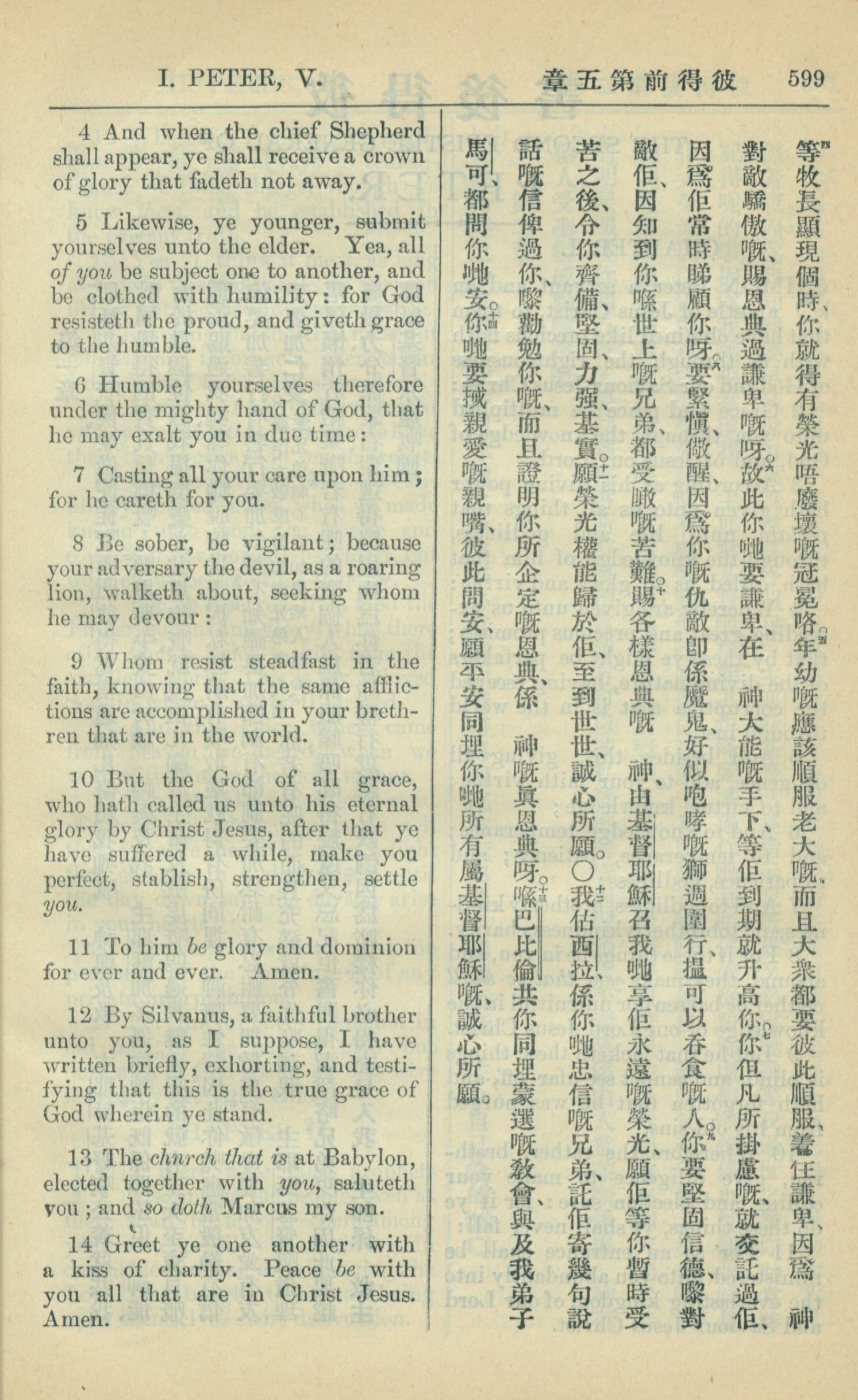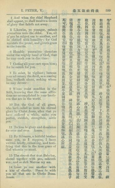 1909年中西字新约全书 彼得前书 5 章 4 节到 5 章 14 节