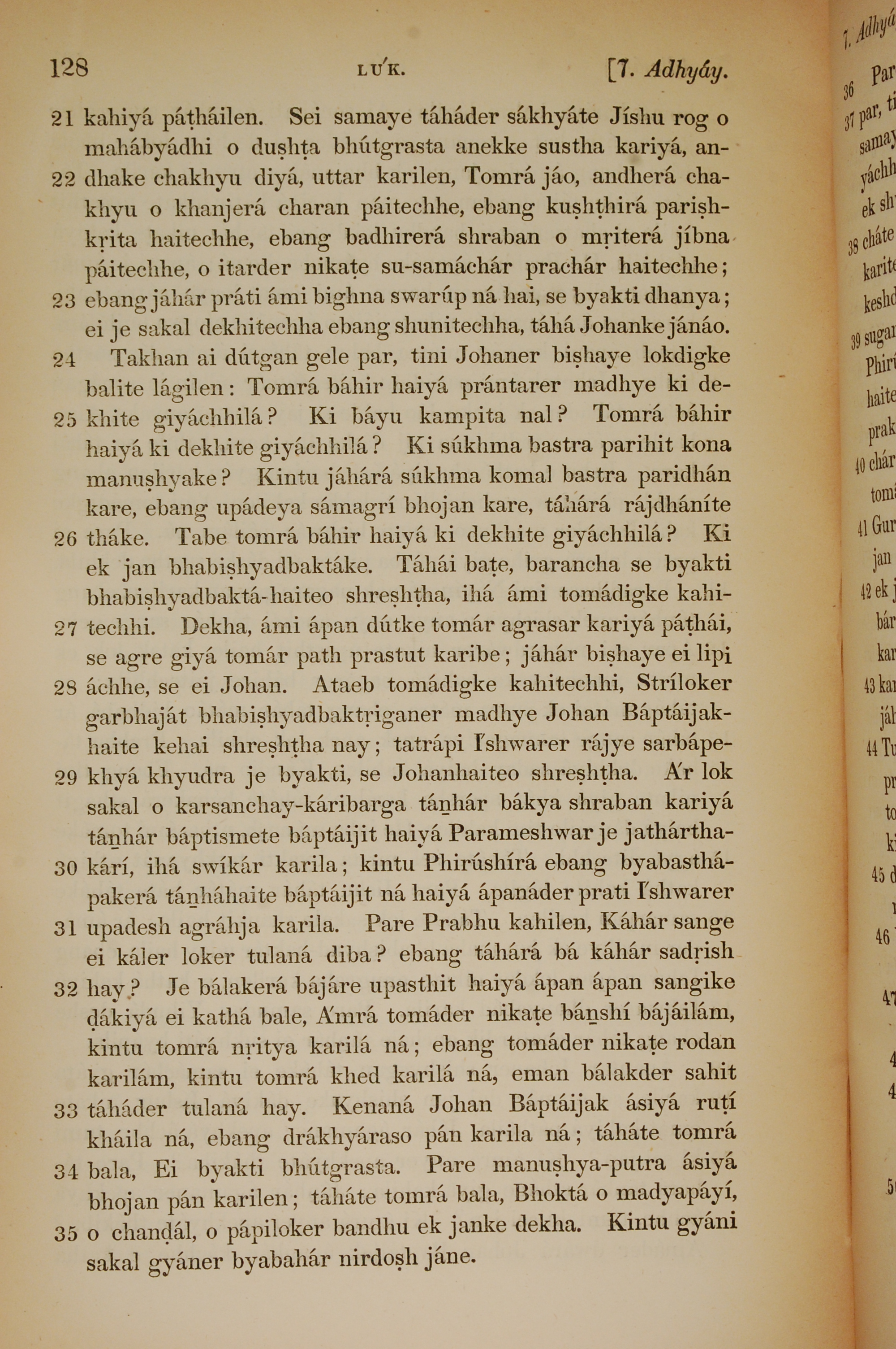 1839年孟加拉语新约全书 路加福音 7 章 21 节到 7 章 35 节