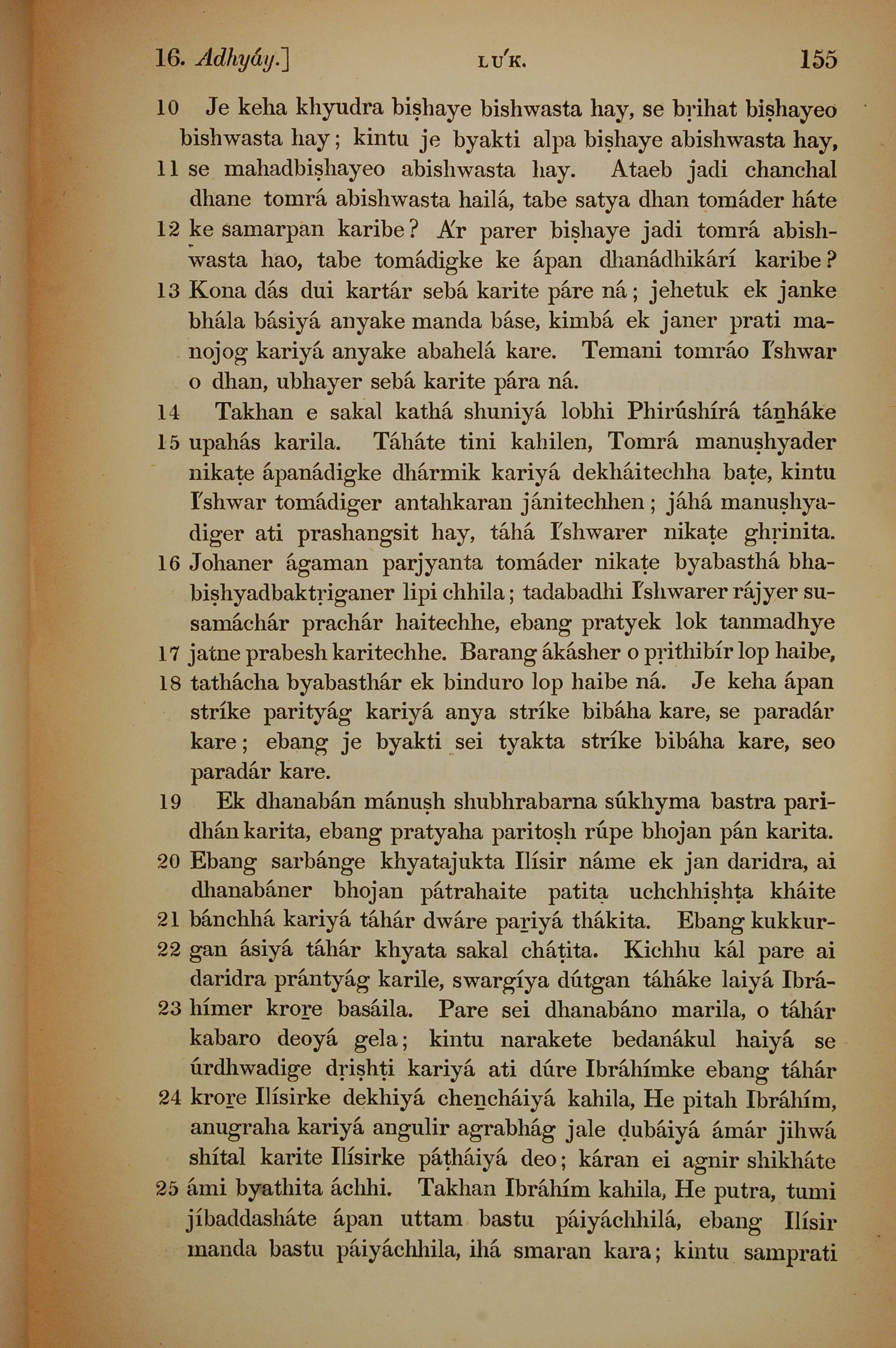 1839年孟加拉语新约全书 路加福音 16 章 10 节到 16 章 25 节