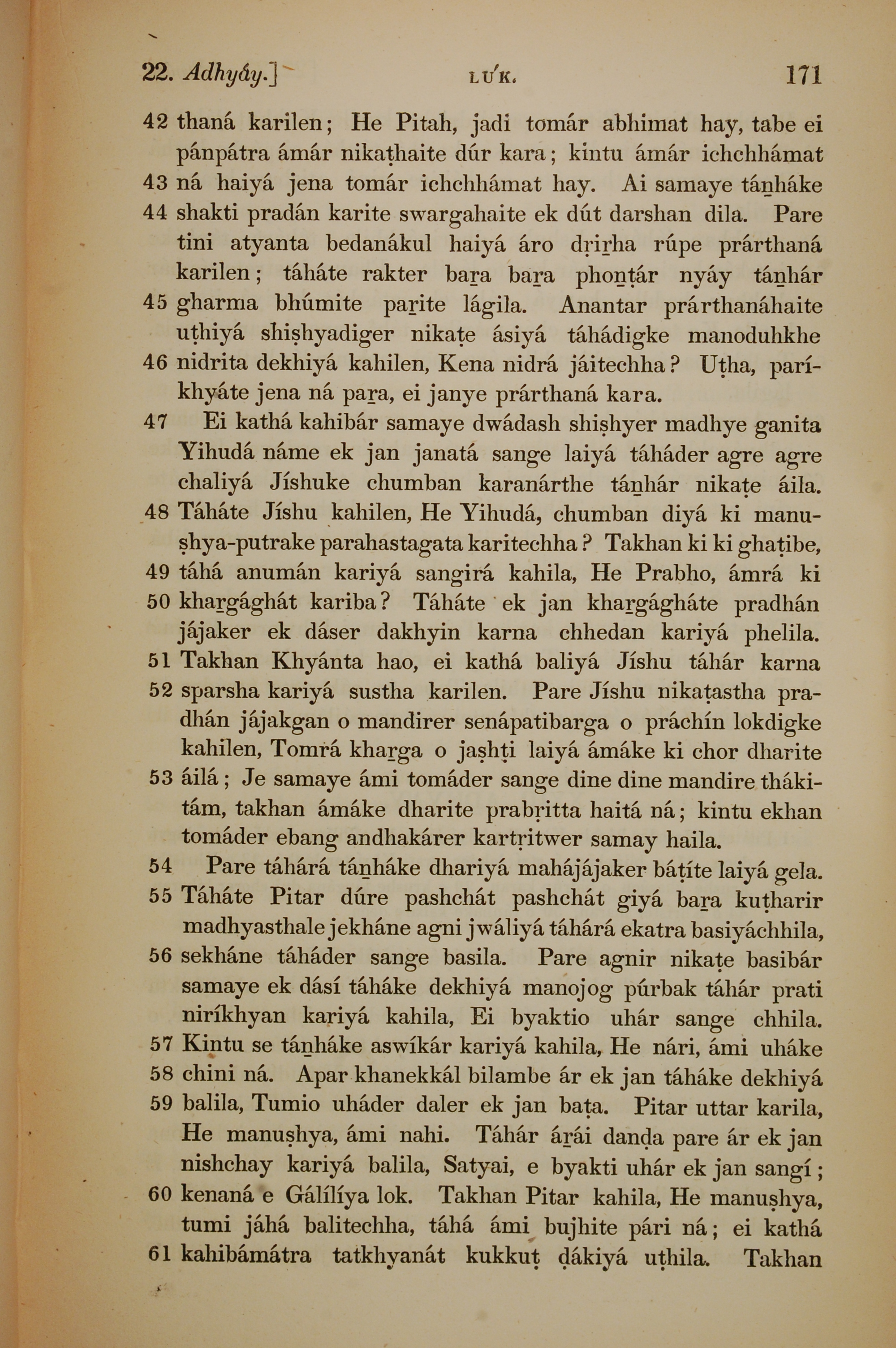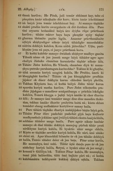 1839年孟加拉语新约全书 路加福音 22 章 42 节到 22 章 61 节