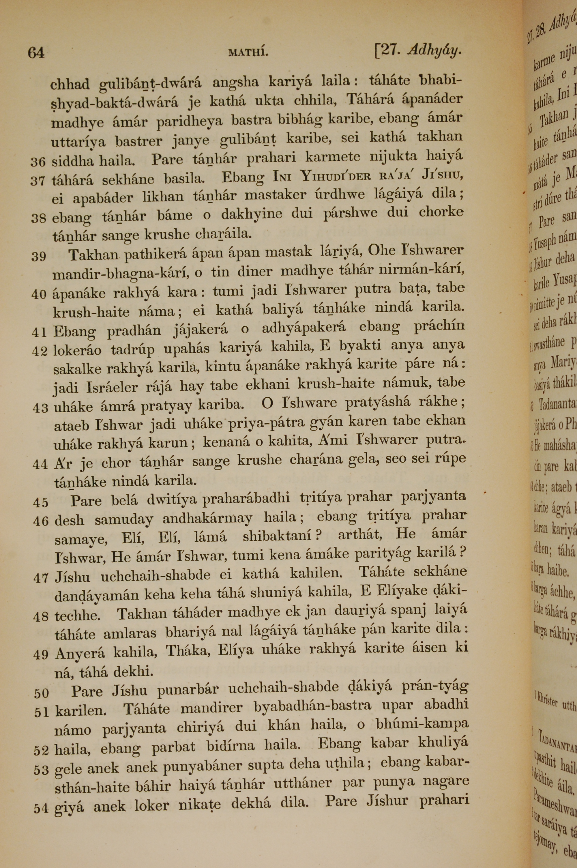 1839年孟加拉语新约全书 马太福音 27 章 36 节到 27 章 54 节