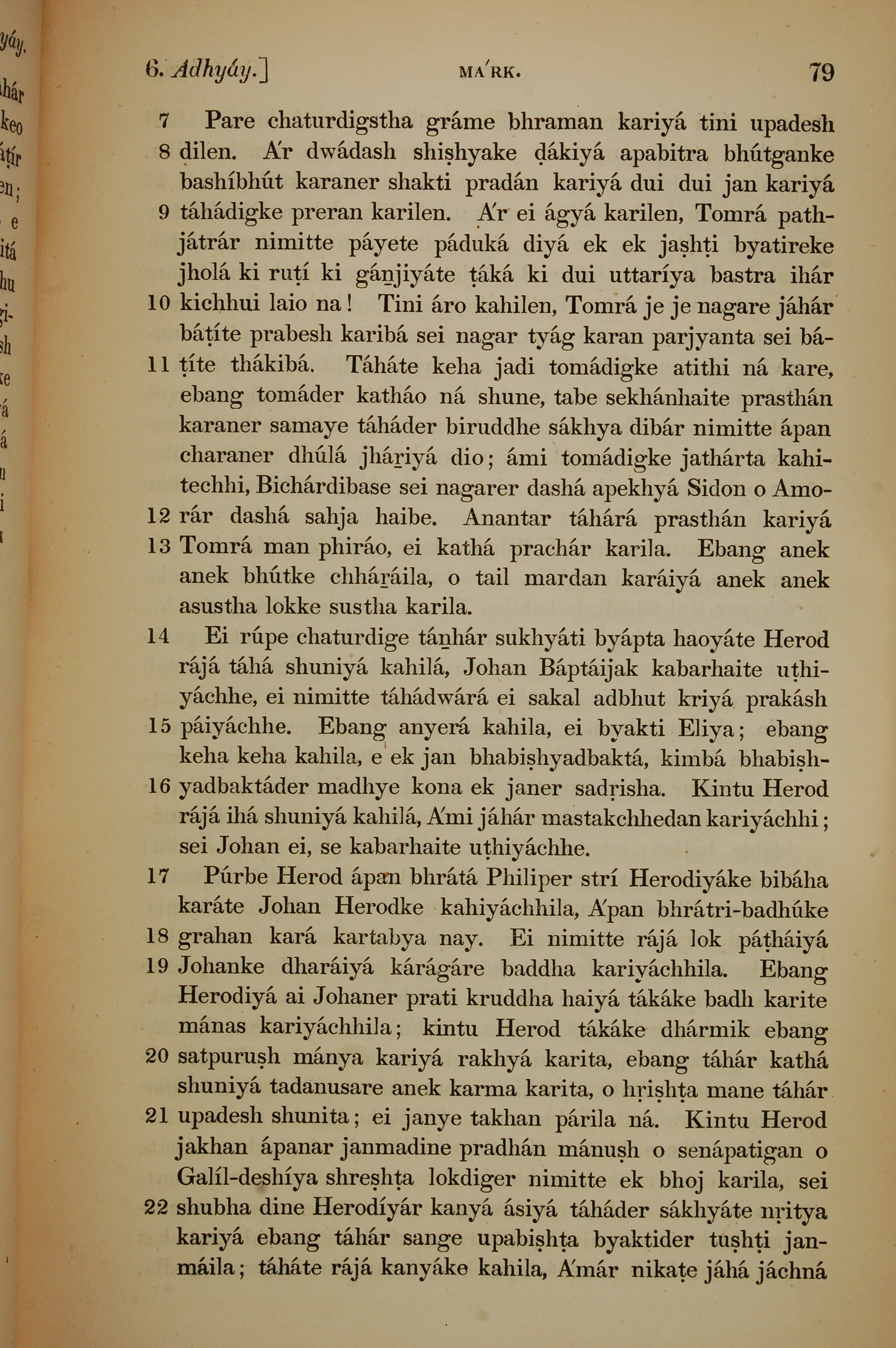 1839年孟加拉语新约全书 马可福音 6 章 7 节到 6 章 22 节