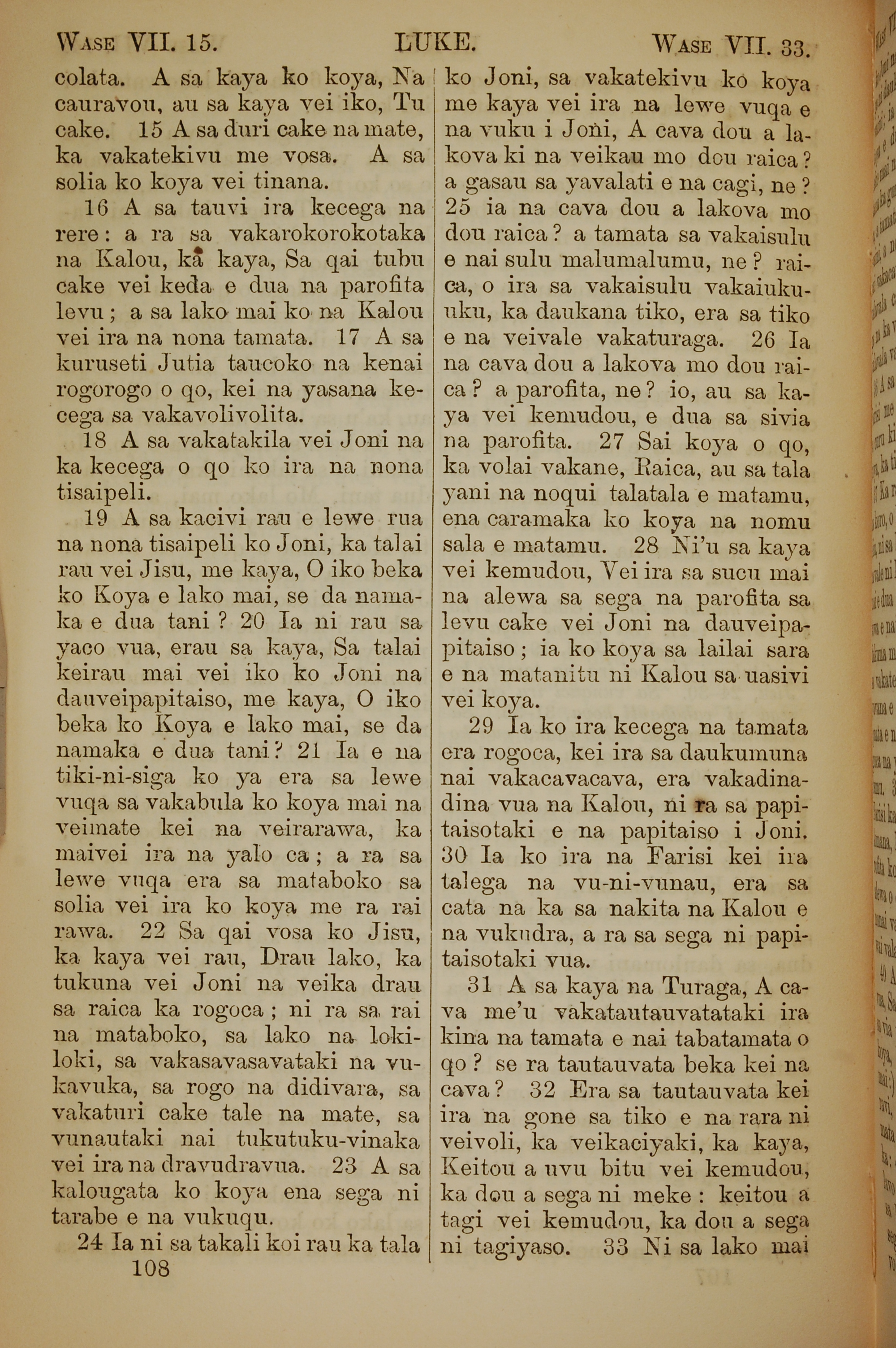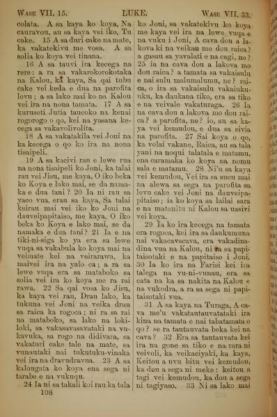 1858年斐济文新约全书 路加福音 7 章 15 节到 7 章 33 节