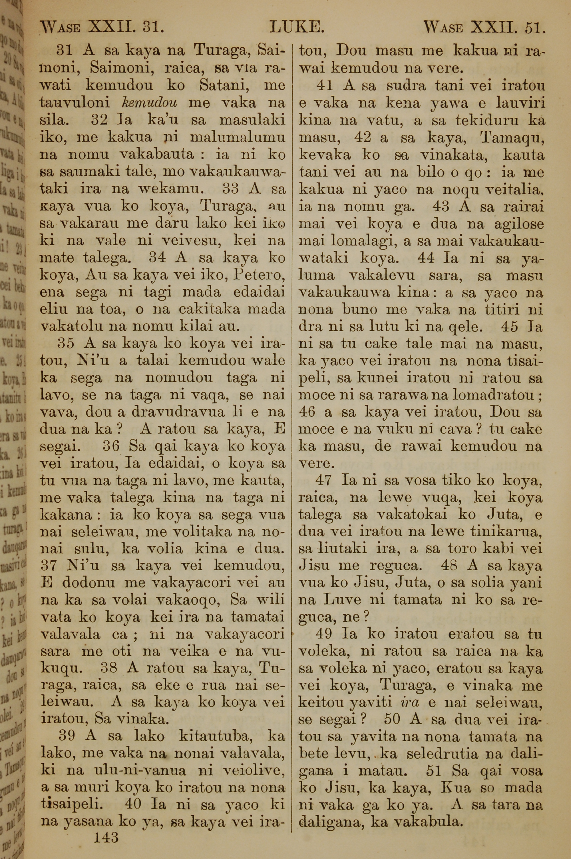 1858年斐济文新约全书 路加福音 22 章 31 节到 22 章 51 节