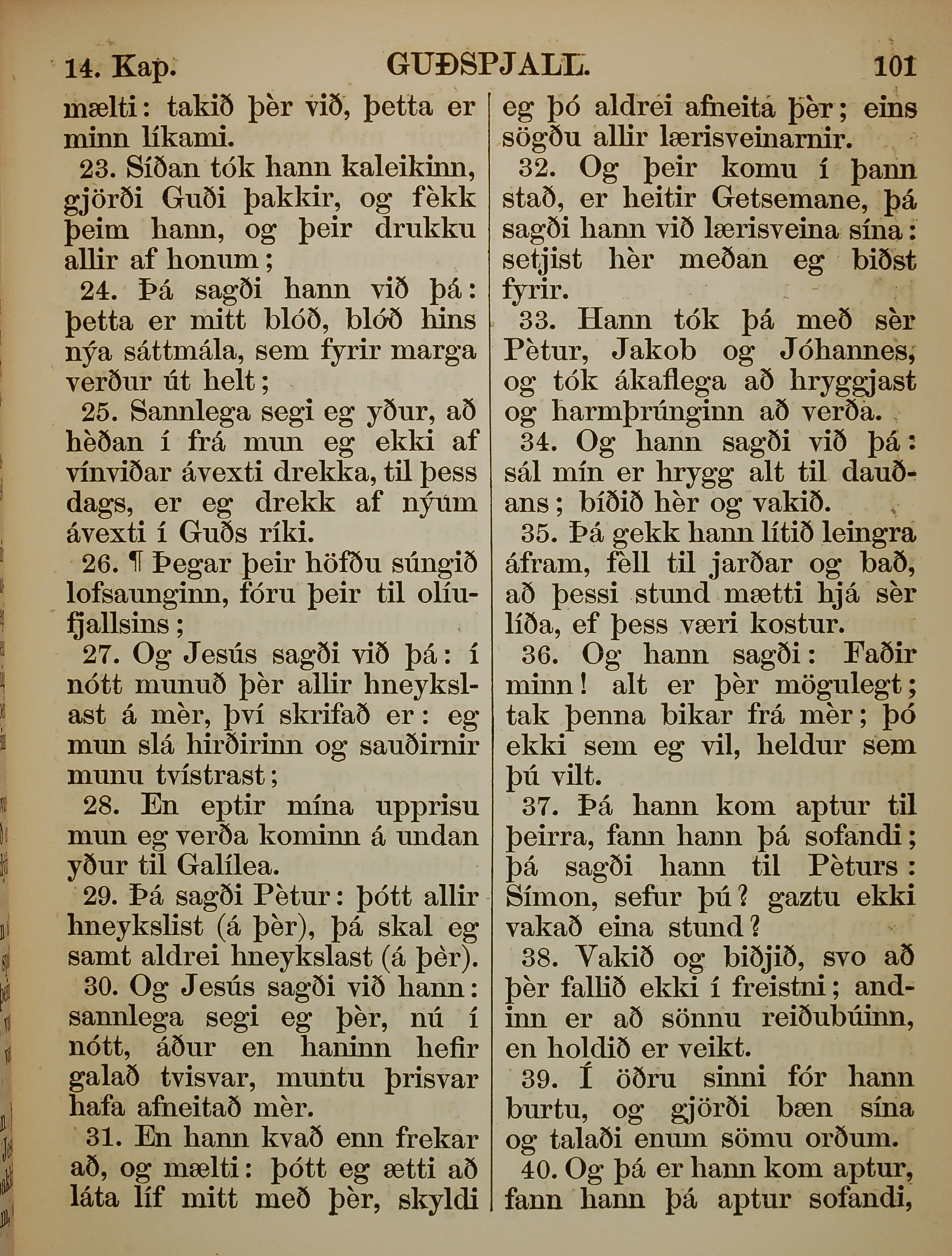 1863年冰岛语新约全书 马可福音 14 章 23 节到 14 章 40 节