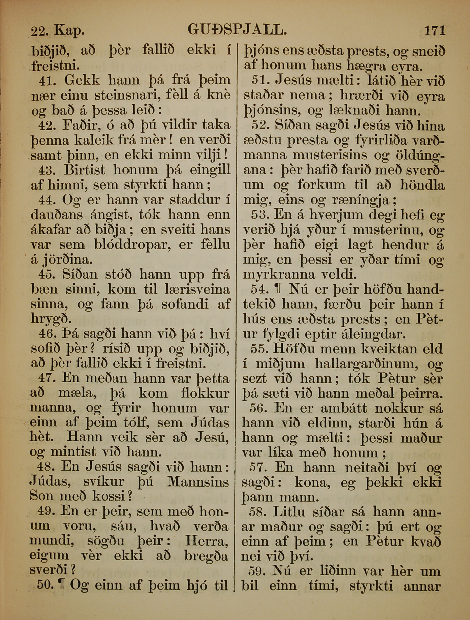 1863年冰岛语新约全书 路加福音 22 章 41 节到 22 章 59 节