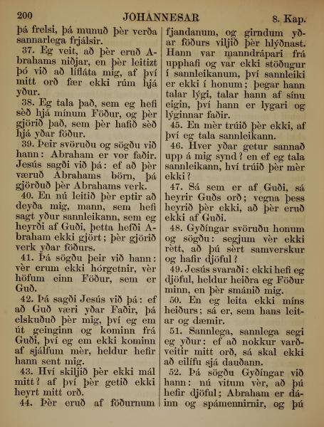 1863年冰岛语新约全书 约翰福音 8 章 37 节到 8 章 52 节