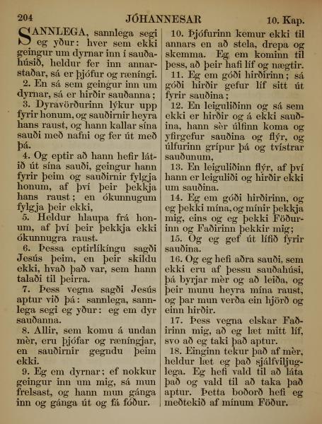 1863年冰岛语新约全书 约翰福音 10 章 1 节到 10 章 18 节