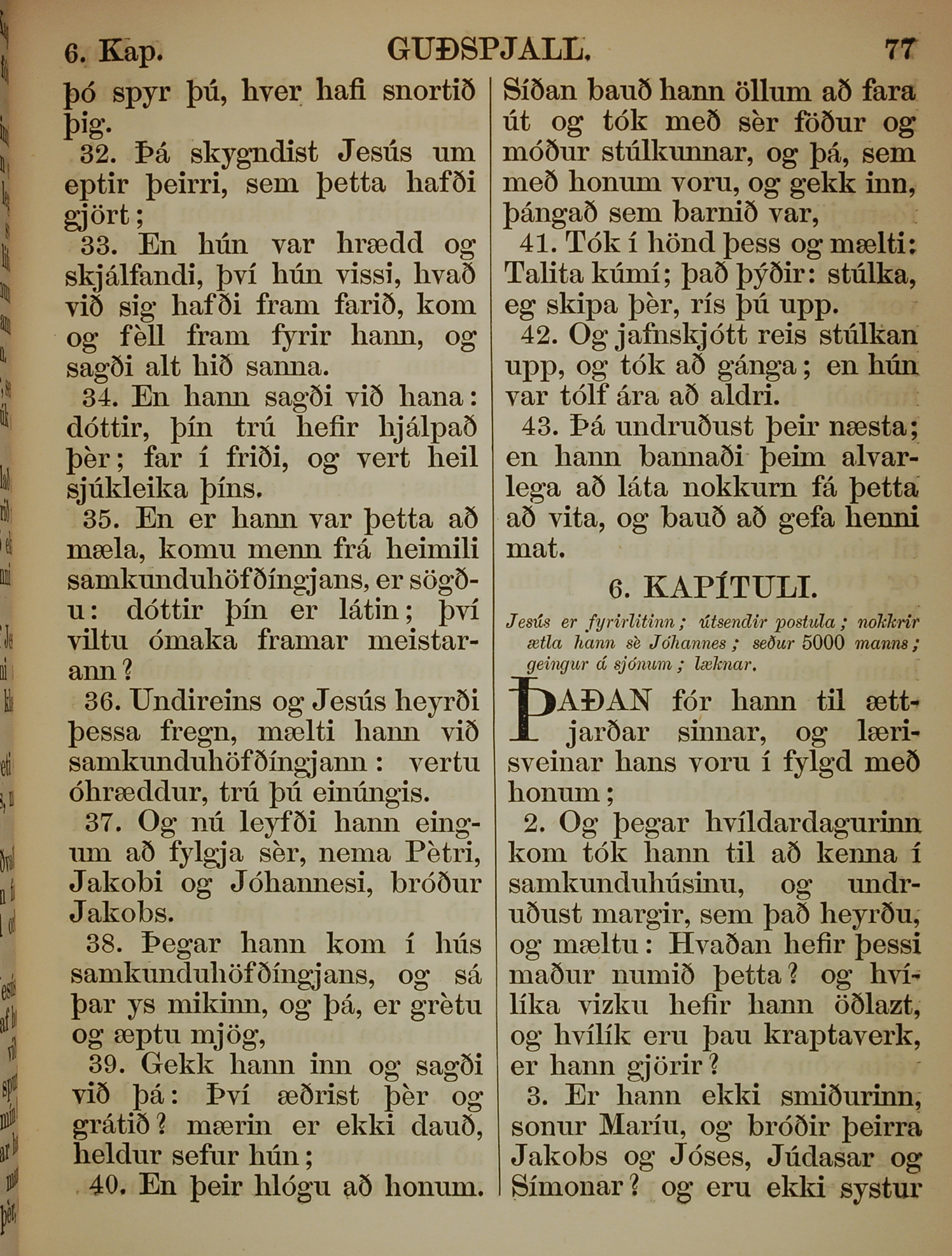 1863年冰岛语新约全书 马可福音 5 章 32 节到 6 章 3 节