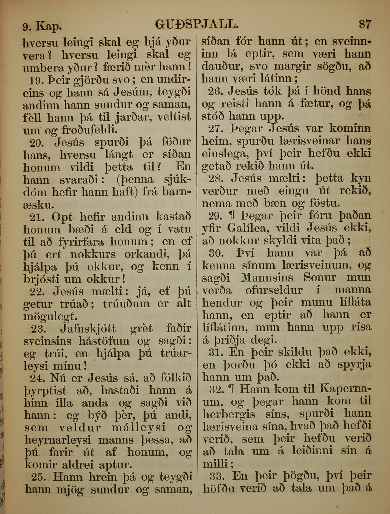 1863年冰岛语新约全书 马可福音 9 章 19 节到 9 章 33 节
