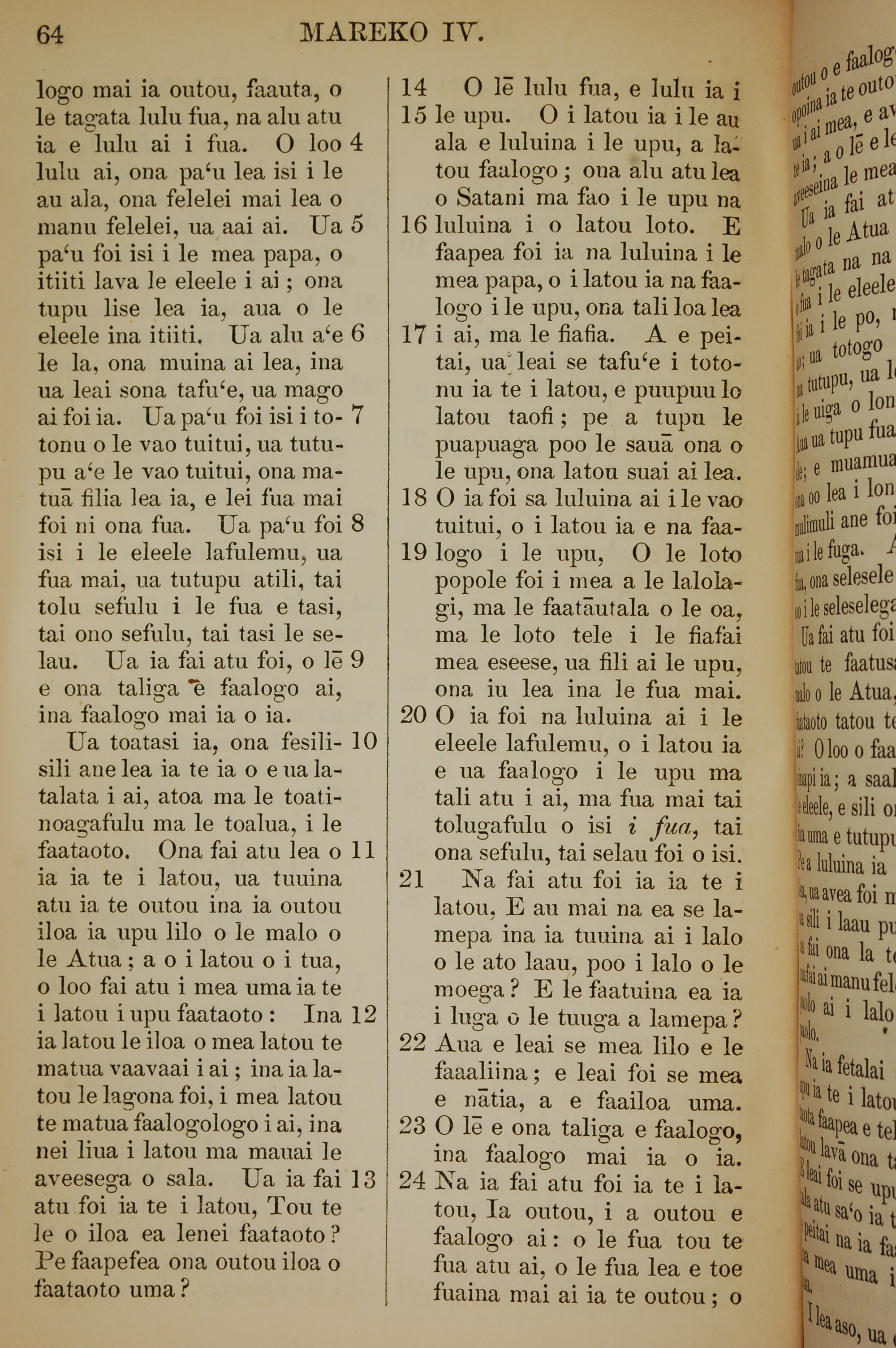 1849年萨摩亚语新约全书 马可福音 4 章 4 节到 4 章 24 节