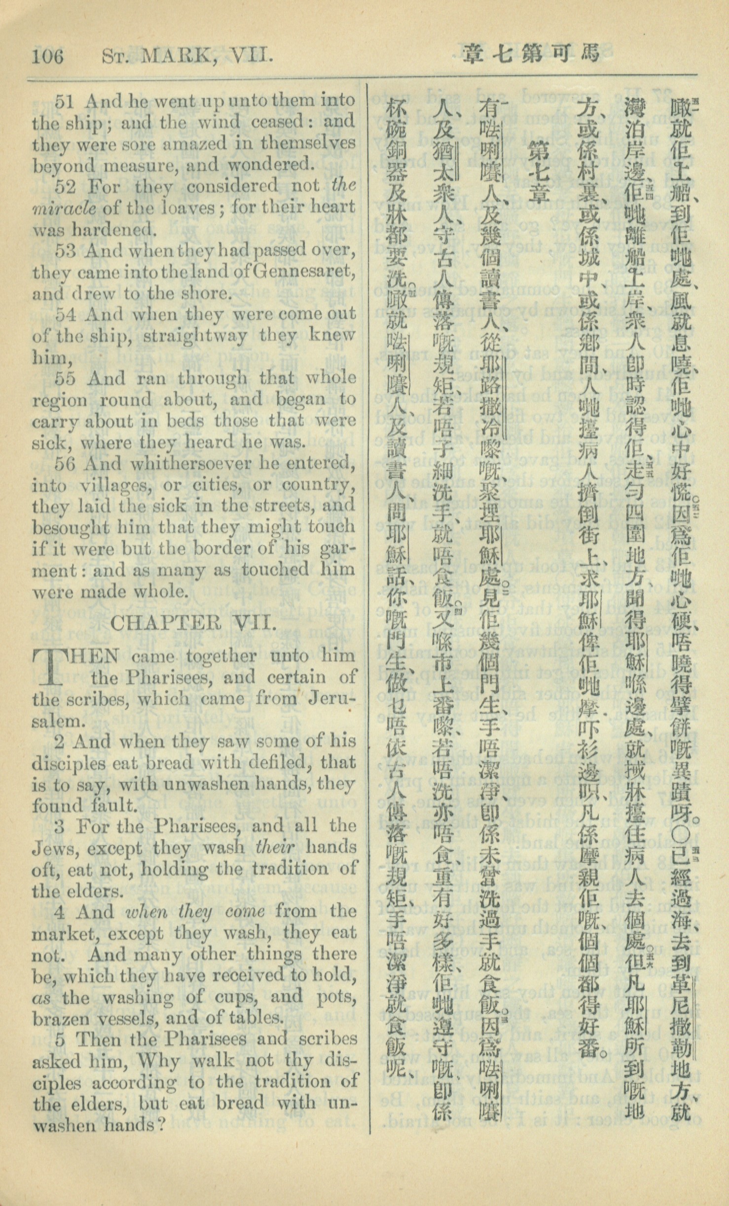 1909年中西字新約全書 馬可福音 6 章 51 節到 7 章 5 節