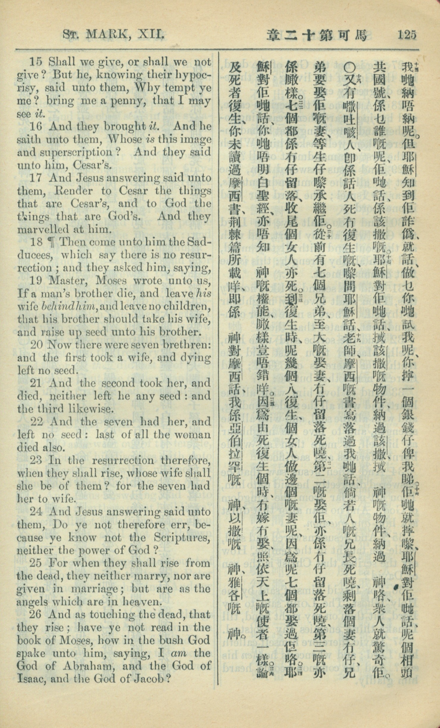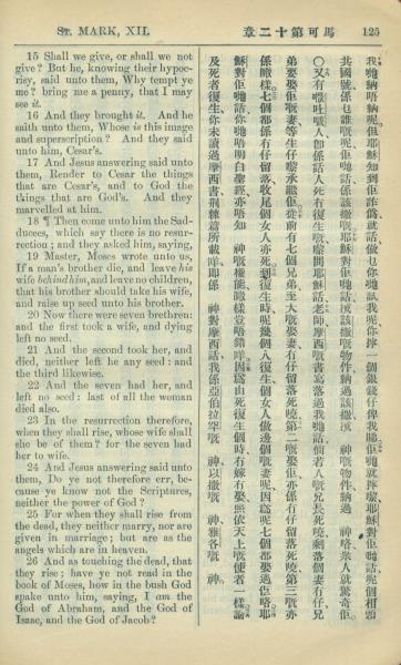 1909年中西字新約全書 馬可福音 12 章 15 節到 12 章 26 節