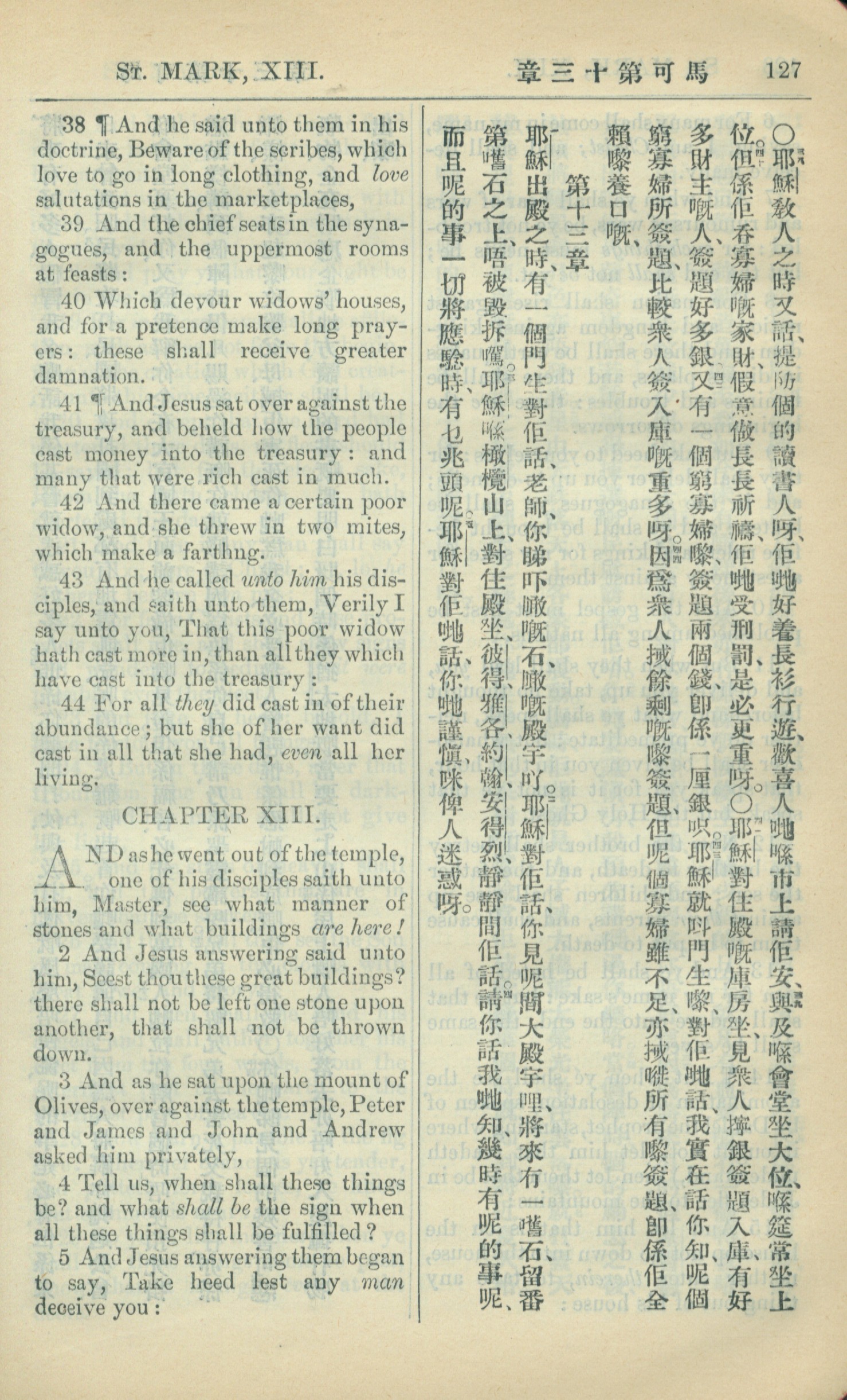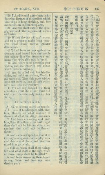 1909年中西字新約全書 馬可福音 12 章 38 節到 13 章 5 節