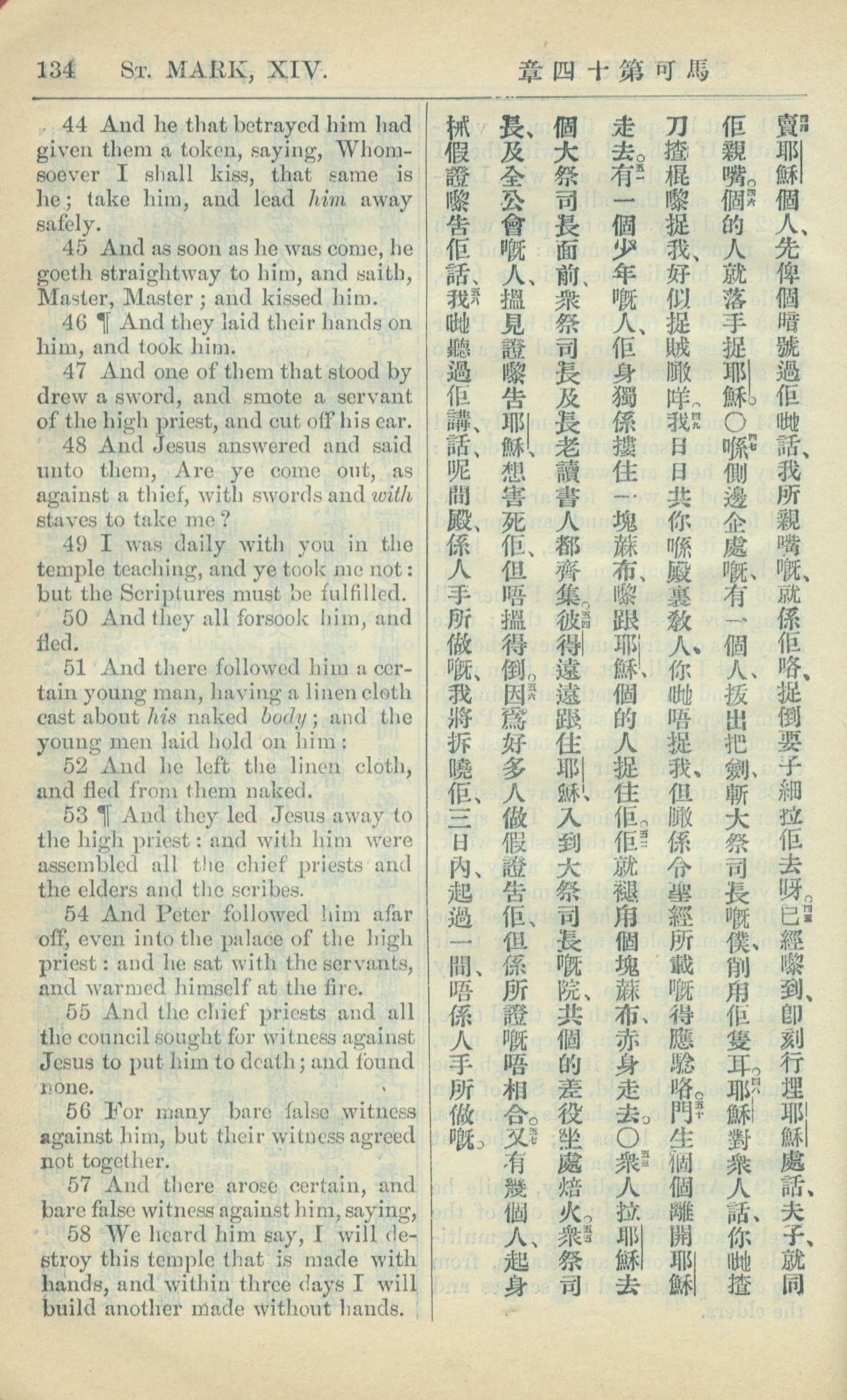 1909年中西字新約全書 馬可福音 14 章 44 節到 14 章 58 節