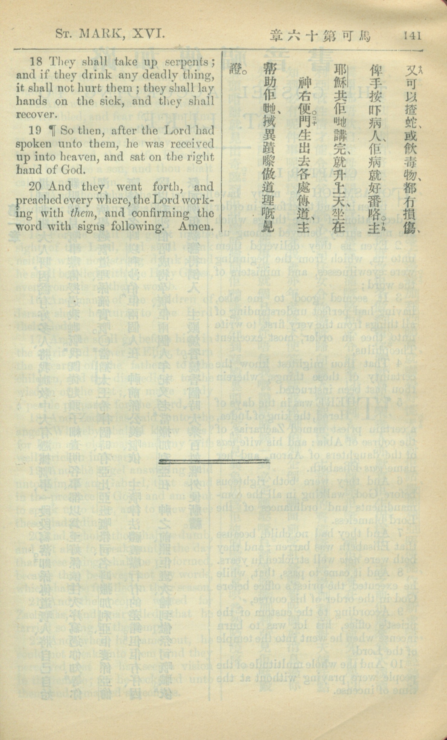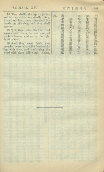 1909年中西字新約全書 馬可福音 16 章 18 節到 16 章 20 節