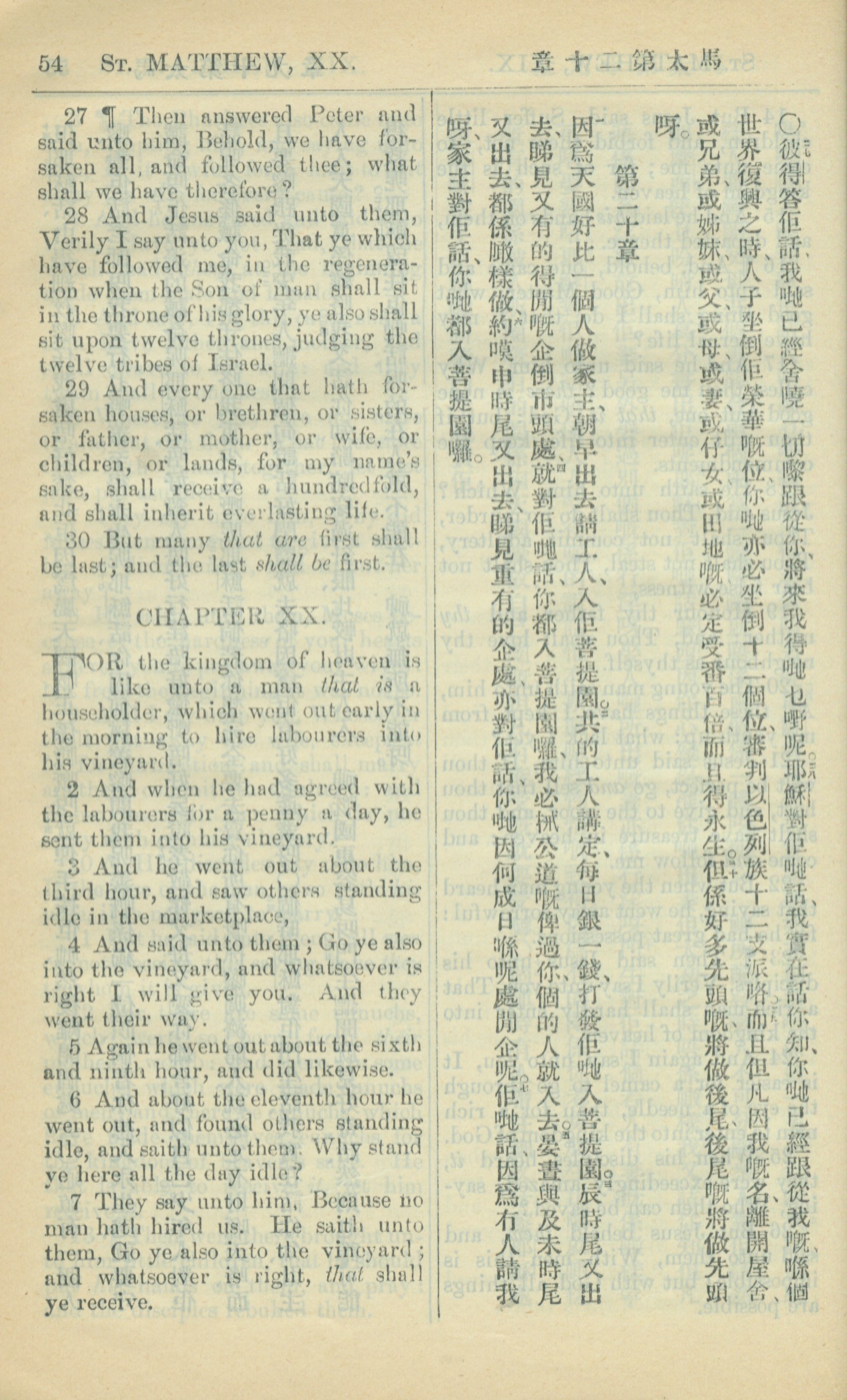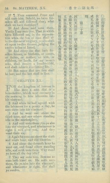 1909年中西字新約全書 馬太福音 19 章 27 節到 20 章 7 節
