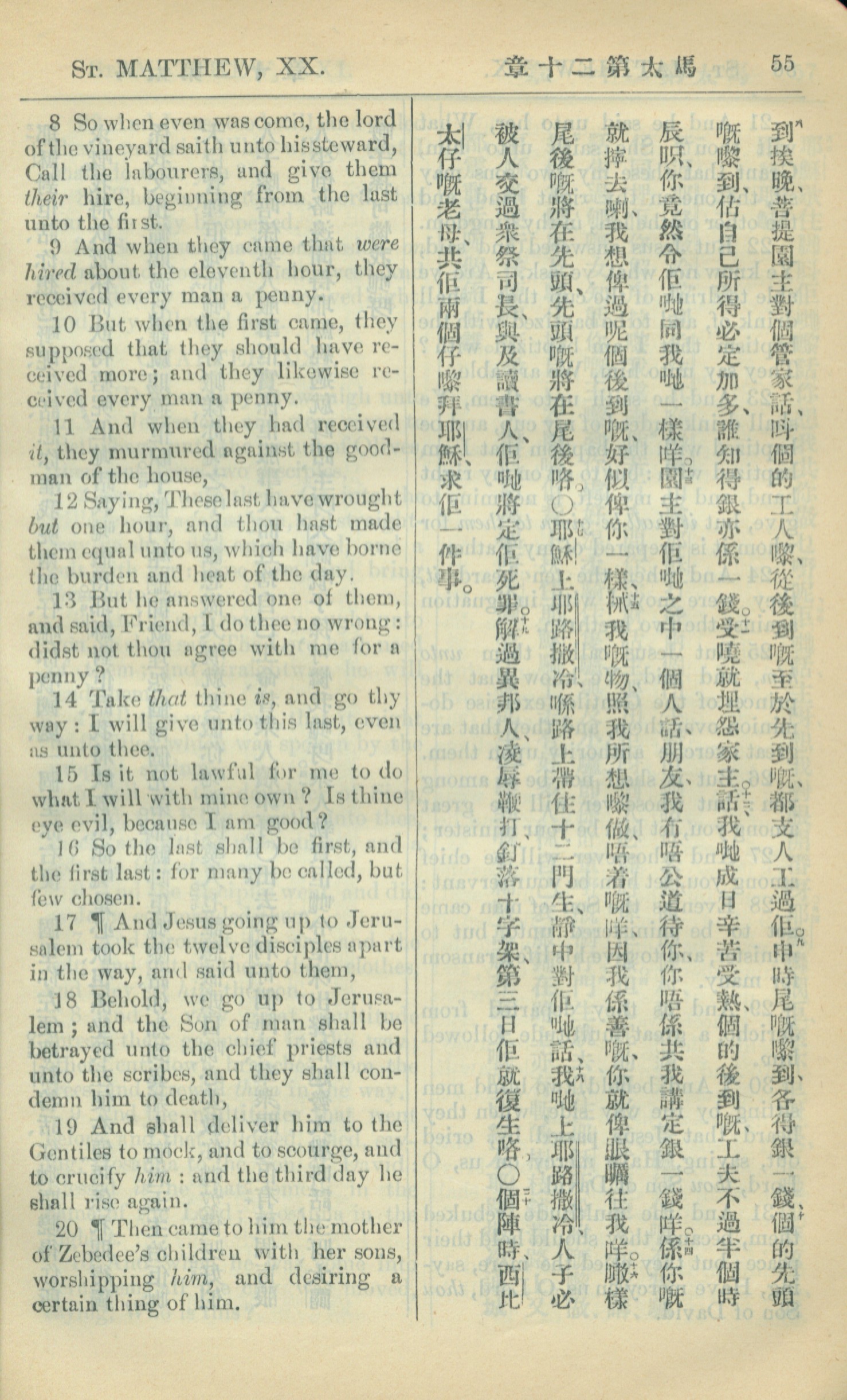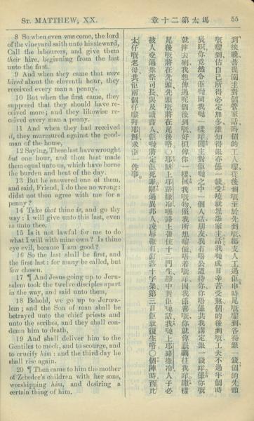 1909年中西字新約全書 馬太福音 20 章 8 節到 20 章 20 節