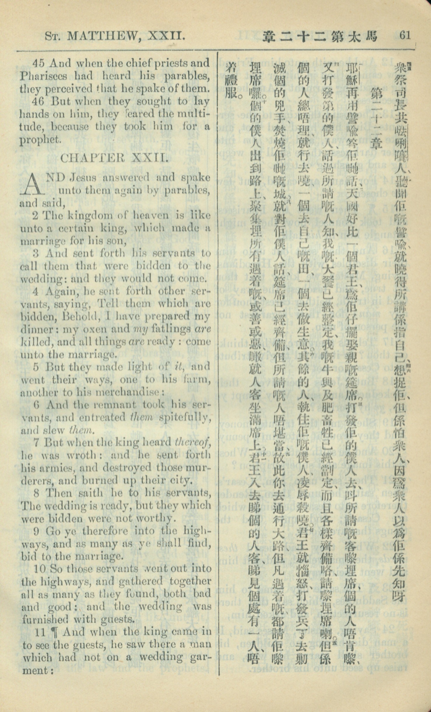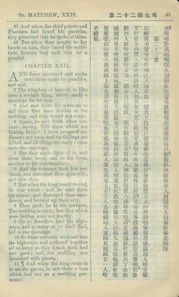 1909年中西字新約全書 馬太福音 21 章 45 節到 22 章 11 節