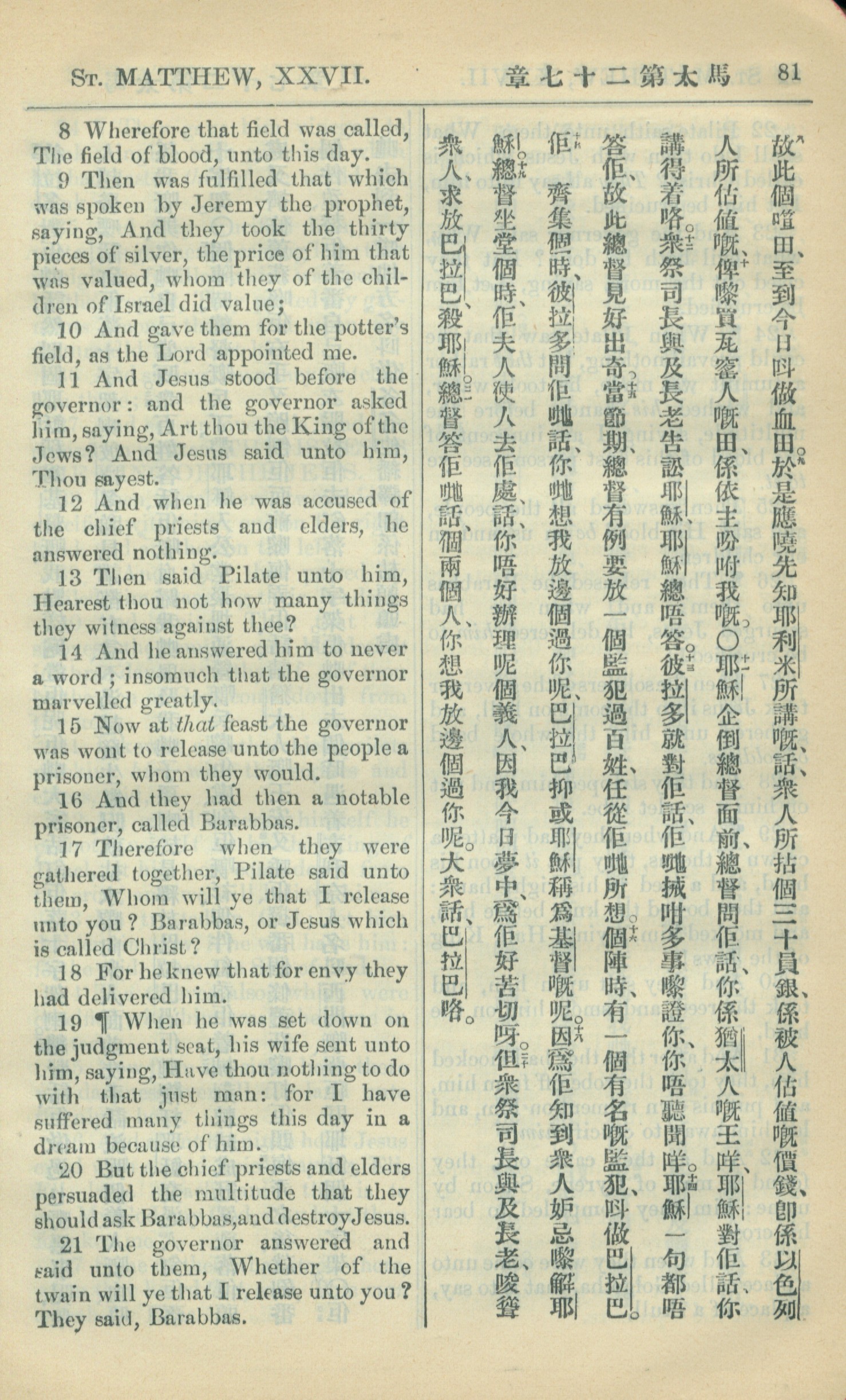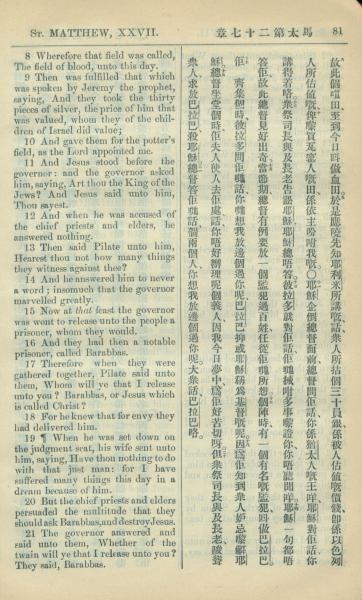 1909年中西字新約全書 馬太福音 27 章 8 節到 27 章 21 節