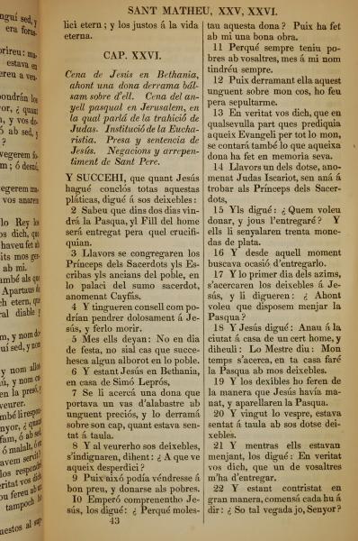 1835年加泰羅尼亞語新約全書 馬太福音 26 章 1 節到 26 章 22 節