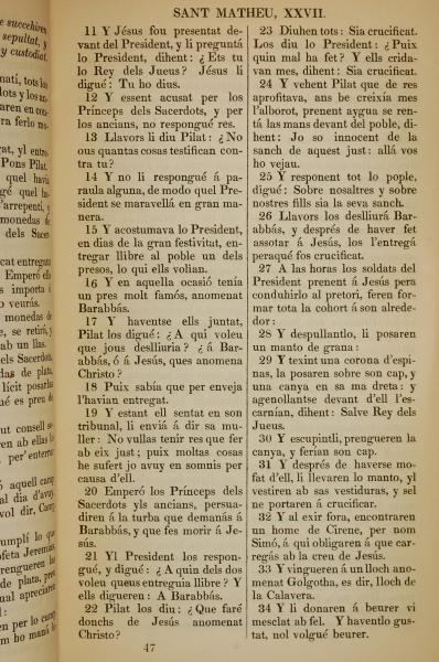 1835年加泰羅尼亞語新約全書 馬太福音 27 章 11 節到 27 章 34 節