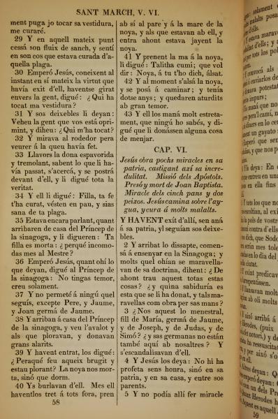 1835年加泰羅尼亞語新約全書 馬可福音 5 章 29 節到 6 章 5 節