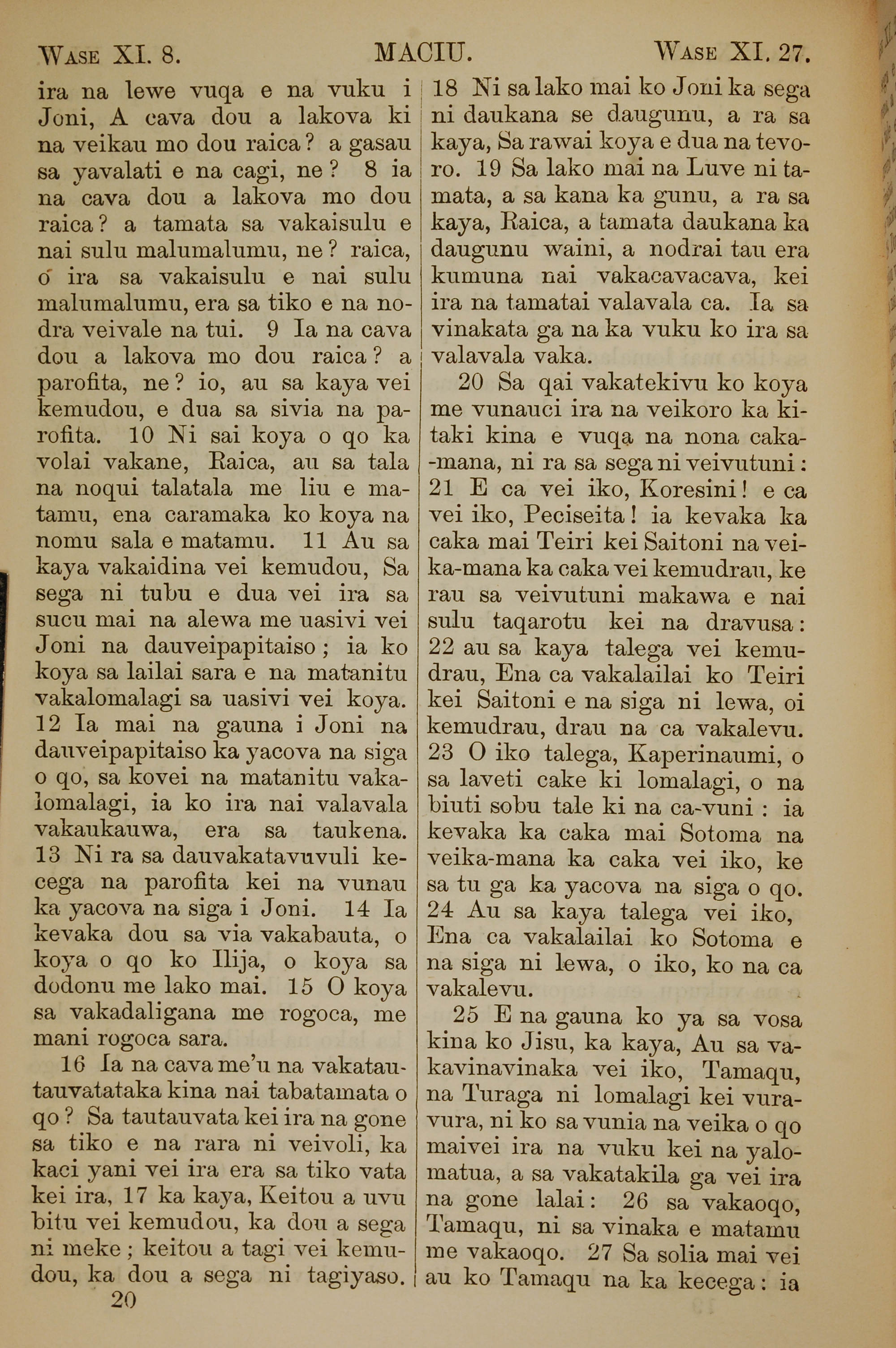 1858年斐濟文新約全書 馬太福音 11 章 8 節到 11 章 27 節