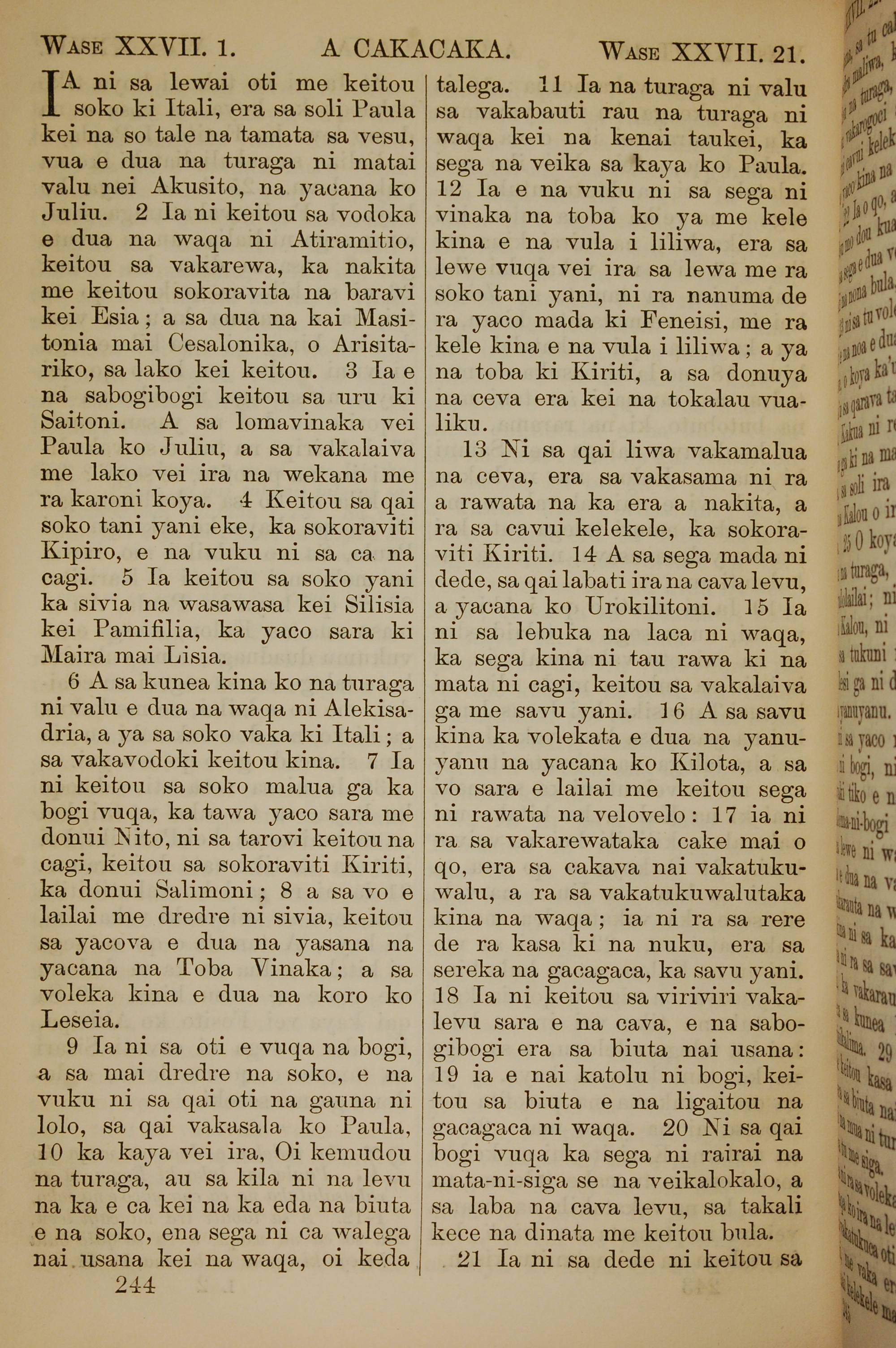 1858年斐濟文新約全書 使徒行傳 27 章 1 節到 27 章 21 節