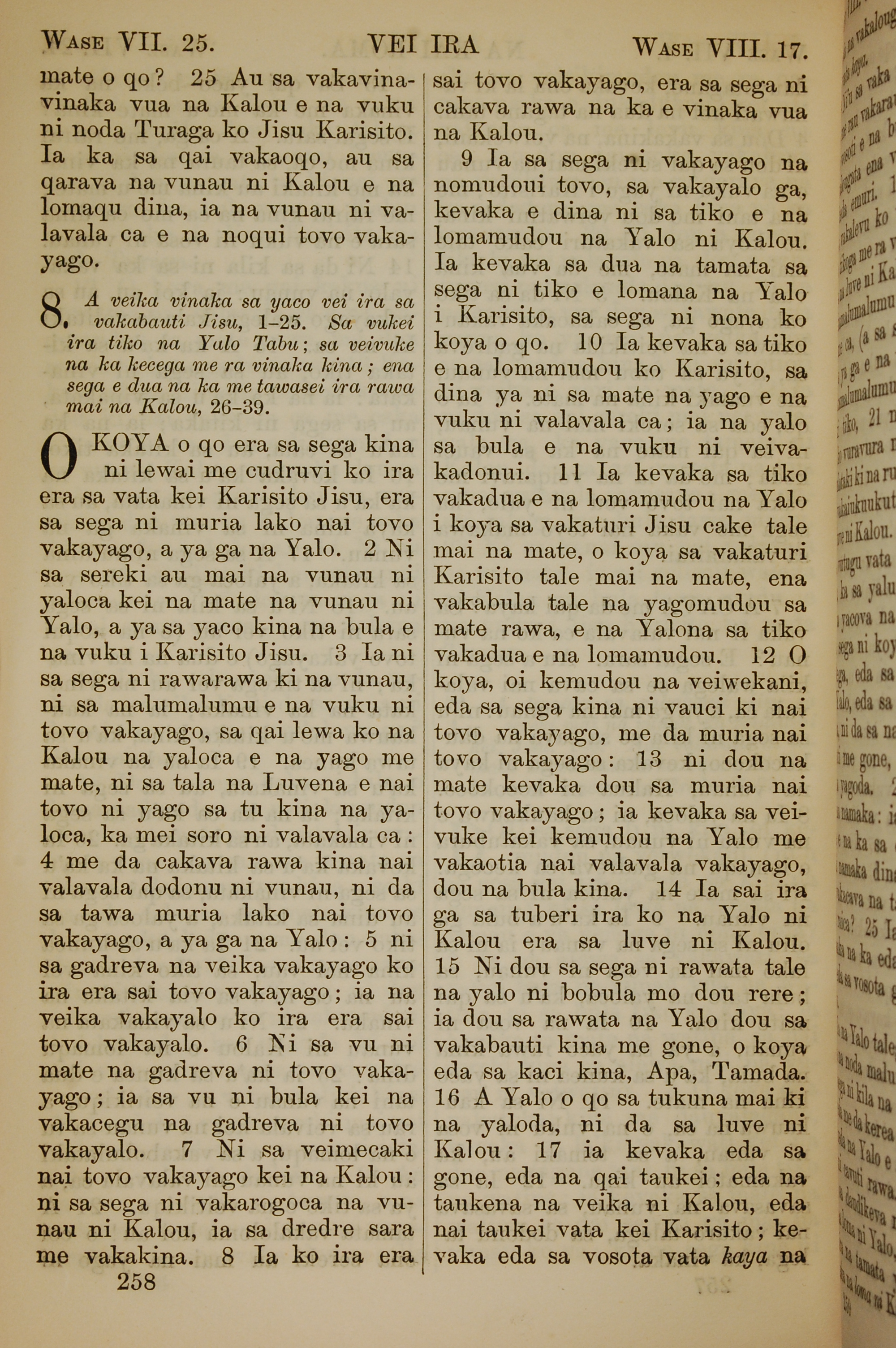1858年斐濟文新約全書 羅馬書 7 章 25 節到 8 章 17 節