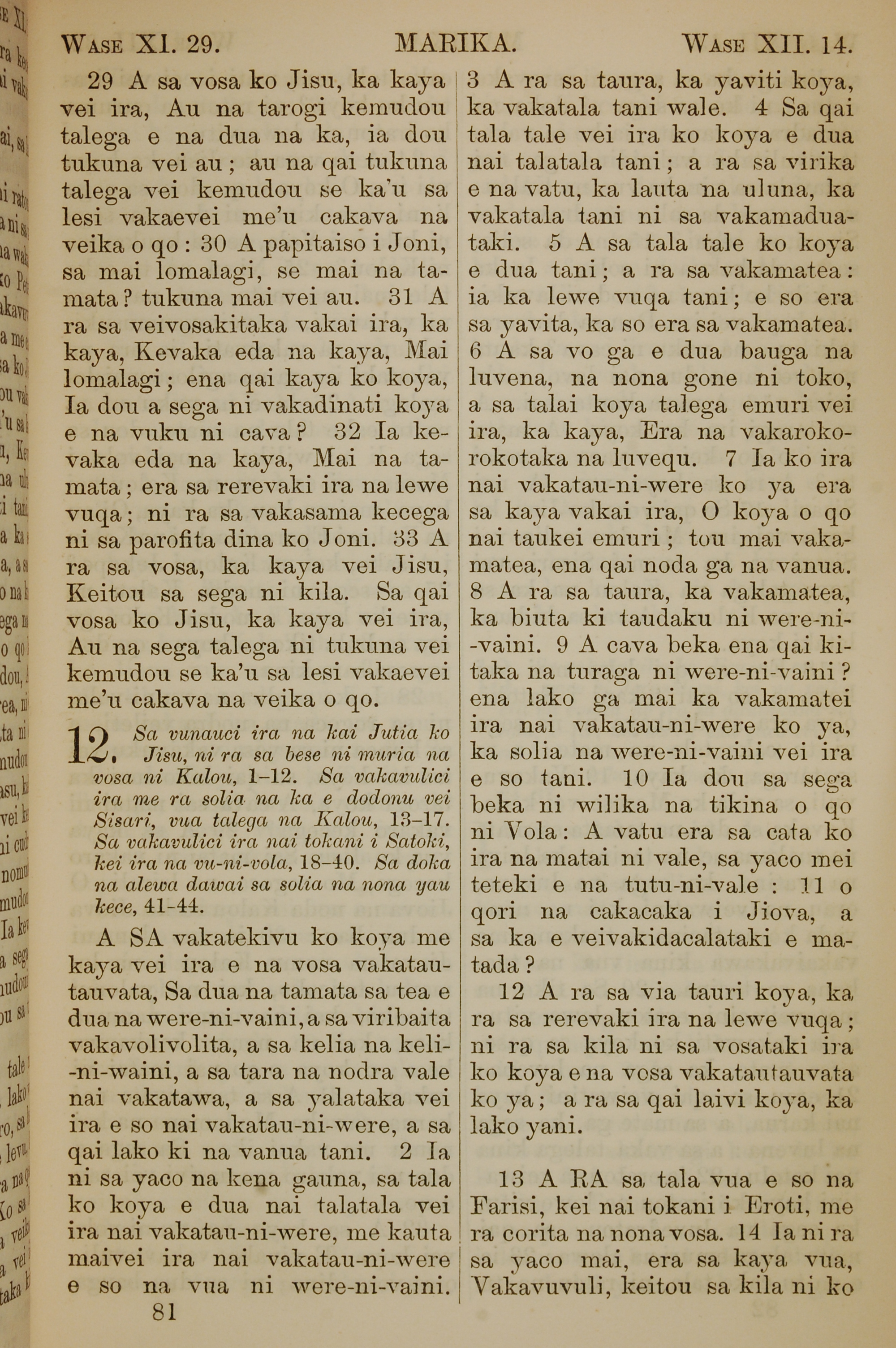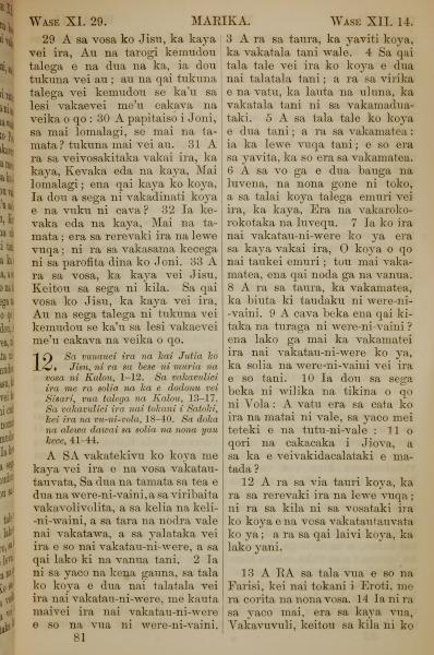 1858年斐濟文新約全書 馬可福音 11 章 29 節到 12 章 14 節