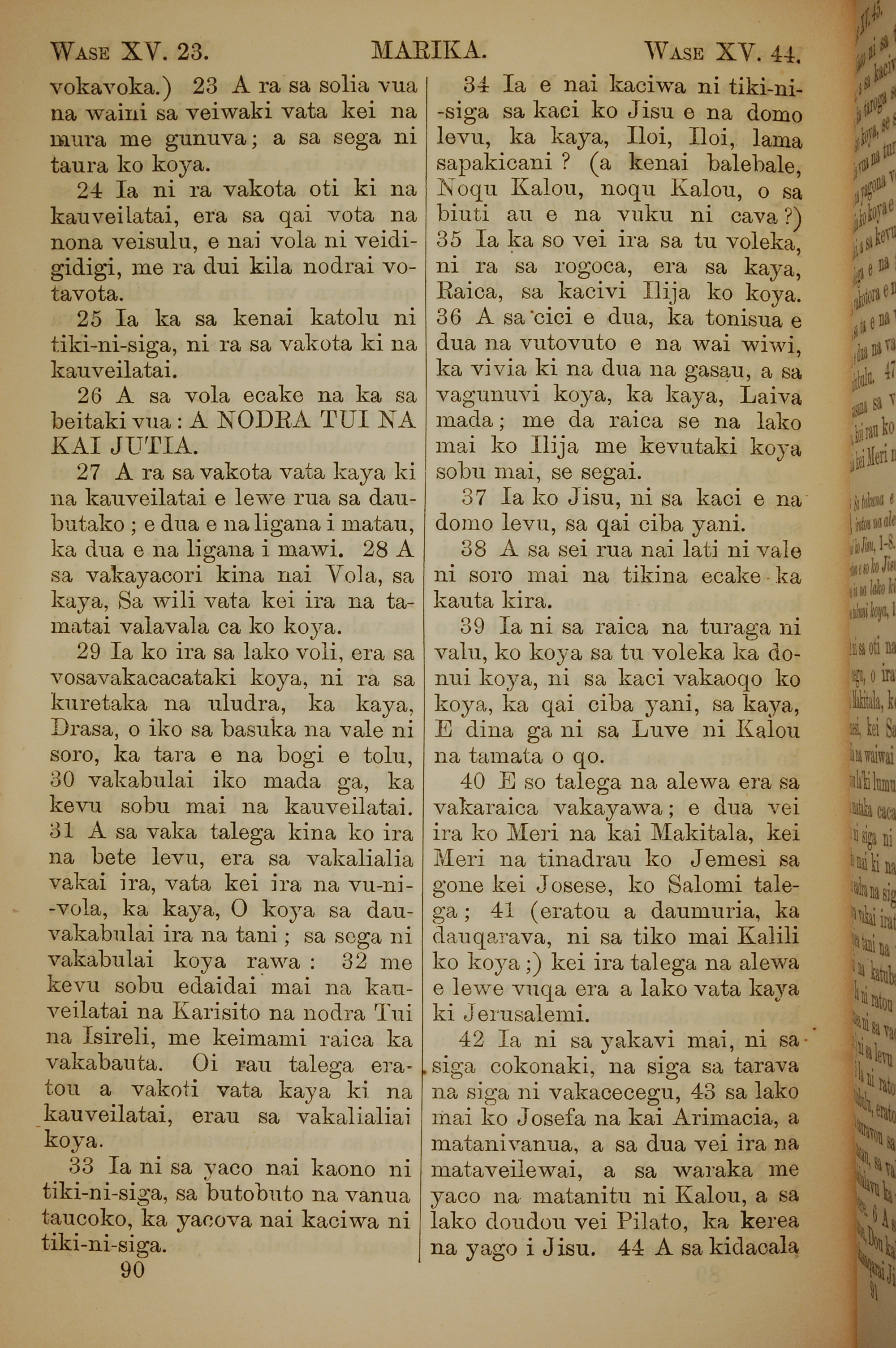 1858年斐濟文新約全書 馬可福音 15 章 23 節到 15 章 43 節